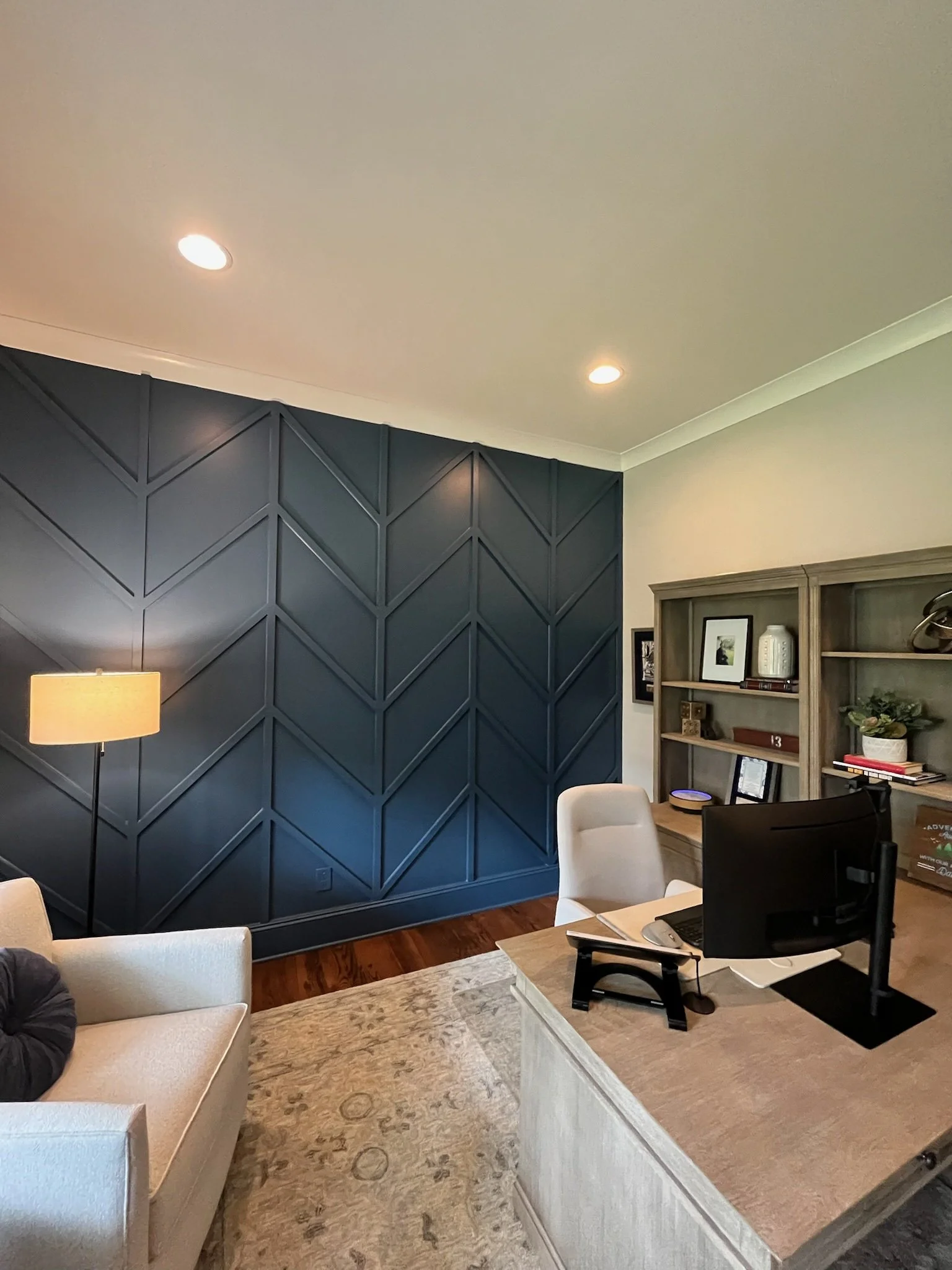 A quick home office renovation including a beautiful accent wall, fresh paint and updated window treatments and accessories.